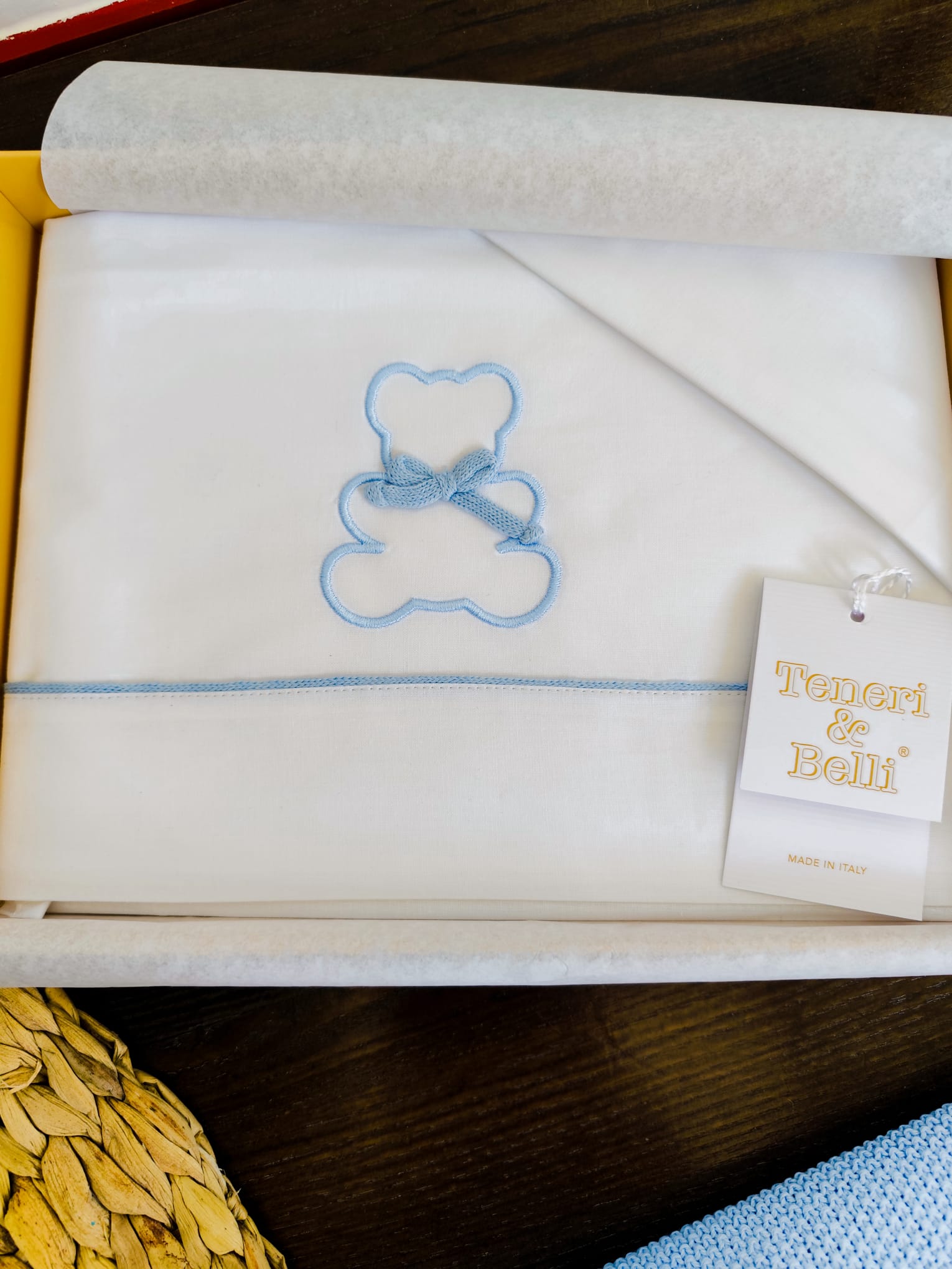 - lenzuoline carrozzina con ricamo orsetto (possibilità di personalizzarle con il nome (whatsapp 3773586349 prenota il ricamo)